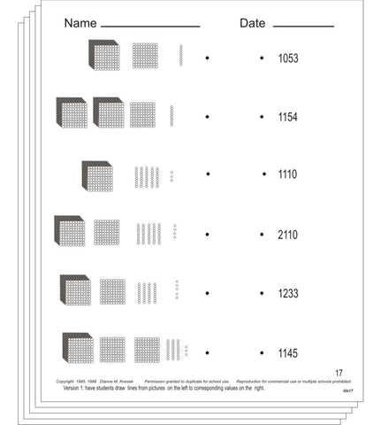 A number of sets for younger children are "color coded." Some teachers present all the levels with an exercise set, while others prefer to present all the blue (two-digit) exercises, progress to the pink (three-digit), and culminate with the green (four-digit).