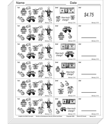 Blackline masters involving large number of coins and change: counting large number of coins and bills, expressing given quantity with different combinations of coins, pricing a combination of items, more challenging change exercises.