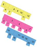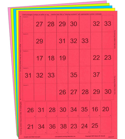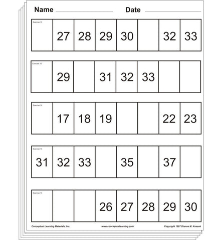 Colorful exercises Strips that have numerals missing from the sequence. Child selects numerals from group of cut-outs and places appropriately. Early exercises start with numbers up to 10, and later exercises culminate with numbers to 50. Most challenging exercises have one or two missing numbers at the beginning of a sequence.  (See Missing Numbers Instructions)