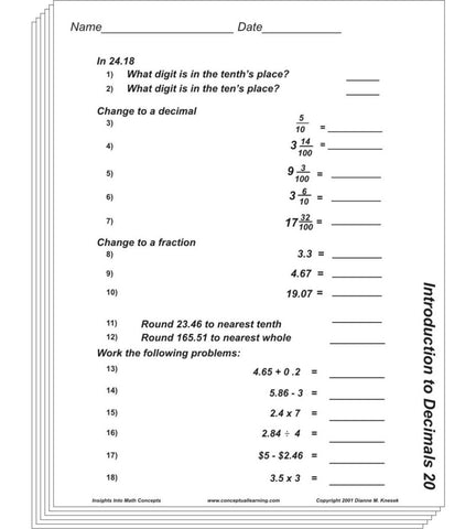 Full-page free-response taskcards focusing on one- and two-place decimals: Fraction to decimal, decimal to fraction, comparisons and rounding, addition and subtraction of decimals, multiplication and division of decimal by whole number, cumulative exercises.